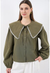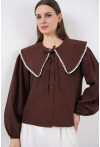 Ürün Içerigi %70 Pamuk %30 Polyester Ürün özellikleri: Kadın Bebe Yaka Gömlek Model Bilgileri Bedeni : 38 Ürün Boyu:56cm Kol Boyu:58cm Manken Ölçüsü : Boy:176 Gögüs:90 Bel:63 Basen:94 Genel Yikama ve Kullanma Talimatlari • El isi ve boncuklu ürünler hassas programda tersten yikanmalidir • Baskili ürünler zamanla dökülebilir • Yikamada ürünü bozmamak için 30 C'yi asmayiniz • Ürünü yikarken yikama talimatina uygun olarak yikayiniz • Renkli ürünlerde uygun deterjan kullaniniz • Denim olan ürünler ve koyu renkli ürünler açik renkli diger ürünler ile yikanirken boyayabilir. Birlikte yikamayiniz • Giysileri kuruturken direkt günes isigina maruz birakmayiniz