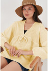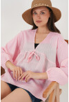 Ürün Içerigi %80 Viskon %20 Naylon Ürün özellikleri Kadın Önü Bağcıklı Uzun Kol Bluz Model Bilgileri Bedeni : 38 Ürün Boyu:63cm Kol Boyu:53cm Manken Ölçüsü : Boy:176 Gögüs:90 Bel:63 Basen:94 Genel Yikama ve Kullanma Talimatlari • El isi ve boncuklu ürünler hassas programda tersten yikanmalidir • Baskili ürünler zamanla dökülebilir • Yikamada ürünü bozmamak için 30 C'yi asmayiniz • Ürünü yikarken yikama talimatina uygun olarak yikayiniz • Renkli ürünlerde uygun deterjan kullaniniz • Denim olan ürünler ve koyu renkli ürünler açik renkli diger ürünler ile yikanirken boyayabilir. Birlikte yikamayiniz • Giysileri kuruturken direkt günes isigina maruz birakmayiniz
